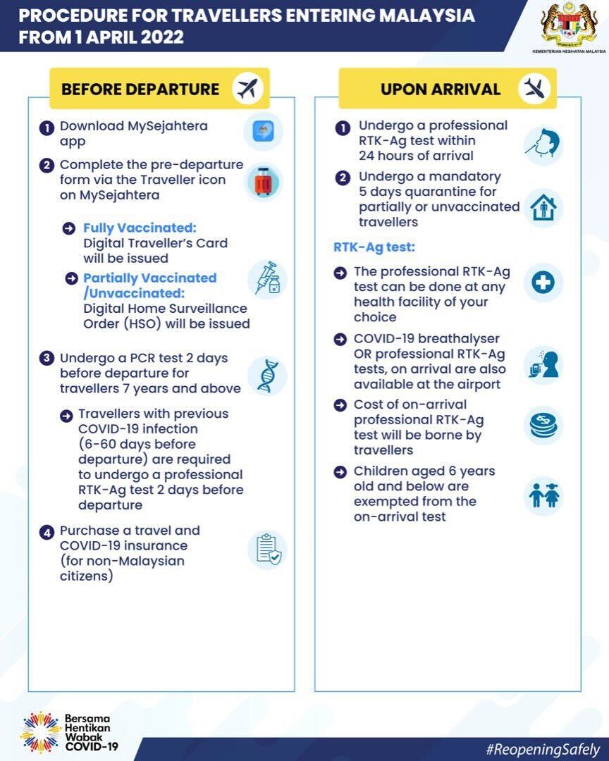 - PCR test by the Ministry of Health at KLIA (Covid-19 screening procedures to be done by private healthcare operators)