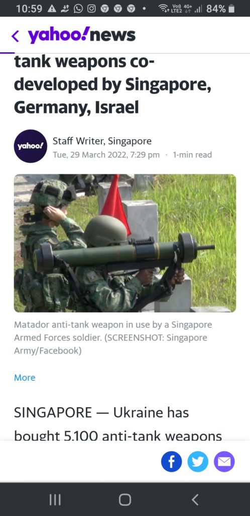 On March 29 Ukraine bought 5,100 anti-tank weapons, The Matador, co-developed by Singapore, Germany and Israel.