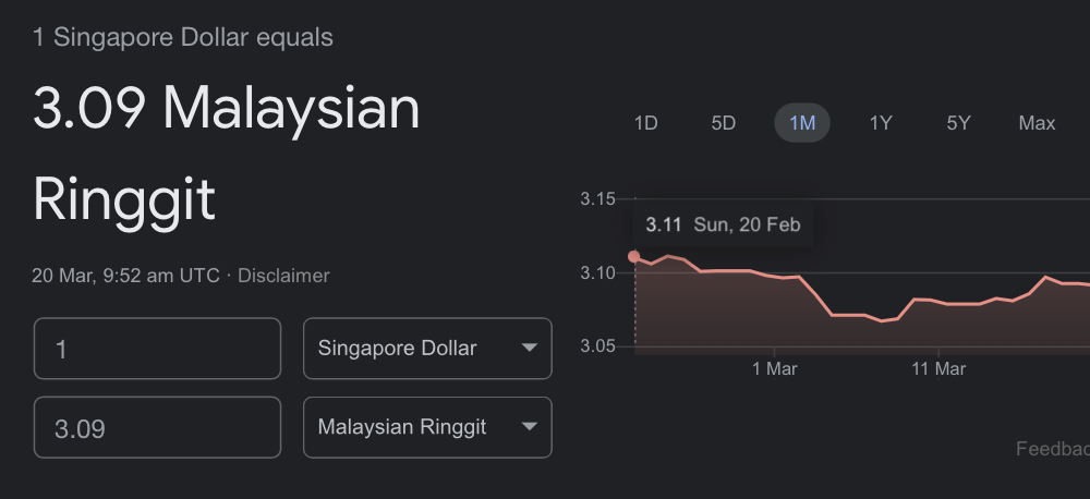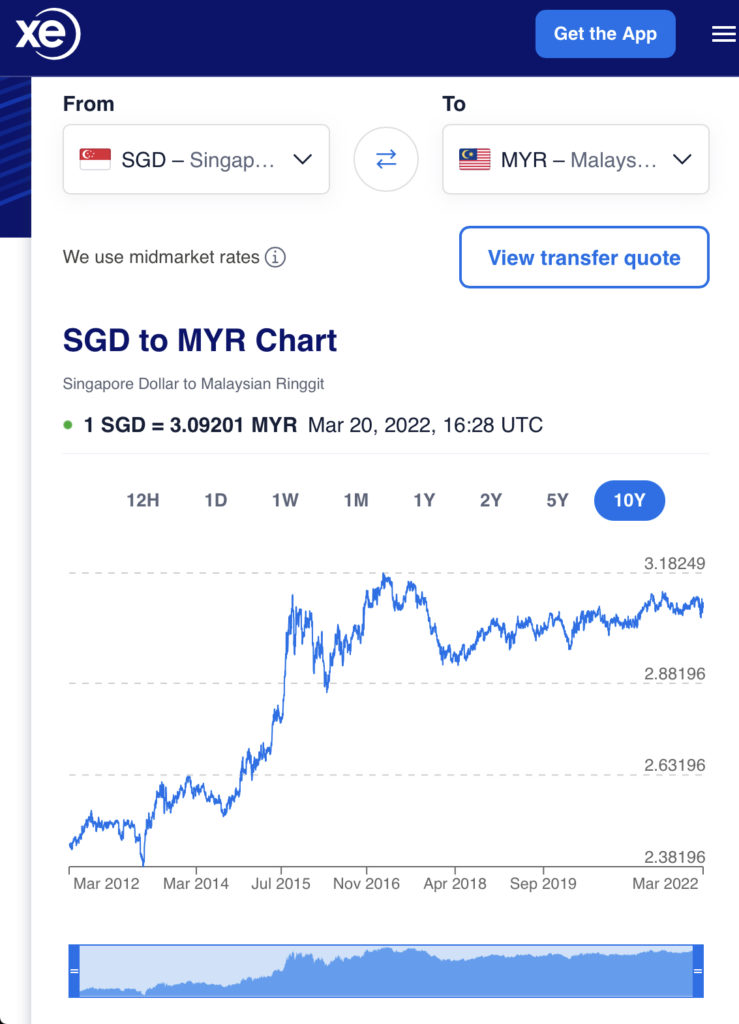Over the past ten years, the Ringgit Malaysia (RM)’s best performance against SGD was in 2013 when SGD1 was equal to RM2.38 and it’s been an embarrassing showing for Malaysians ever since. In just two years after 2013, RM became increasingly devalued against SGD that the latter had tripled the worth of RM in 2015. Furthermore, throughout the subsequent seven years, SGD1 has always been worth around RM3 on average, with the exchange rate being SGD1=RM3.09 as of 20 March 2022.