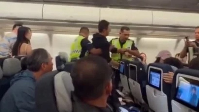 不久后,两名警卫将该男子带离机舱。