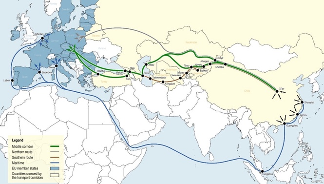 “中间走廊”(Middle Corridor),又称跨里海国际运输路线(Trans-Caspian International Transport Route, TITR),是一条连接中国、东南亚与欧洲的重要贸易通道,主要通过中亚和里海地区,避开俄罗斯与苏伊士运河。