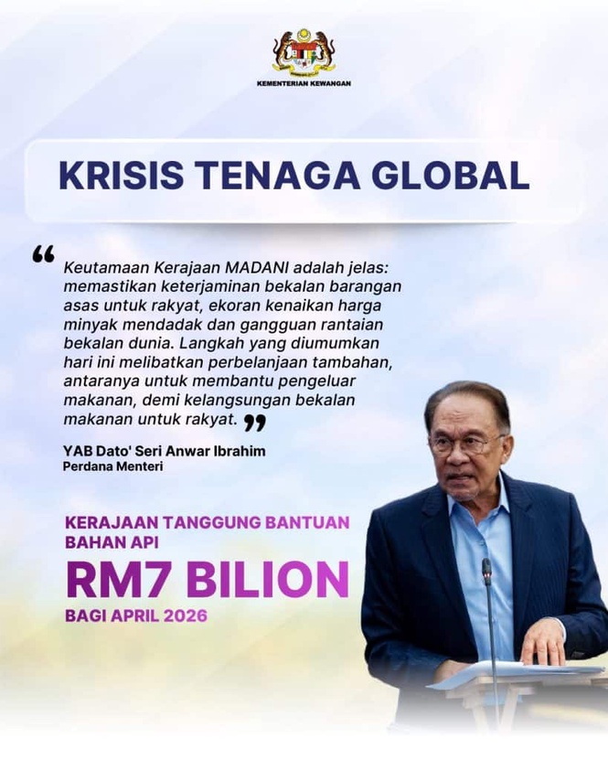 Susulan impak kenaikan harga pasaran produk petroleum, Kerajaan telah menaikkan bantuan tunai Budi Diesel kepada RM400 sebulan daripada RM300 bagi tempoh interim. Bayaran tambahan RM100 akan dibuat mulai 21 April 2026.
