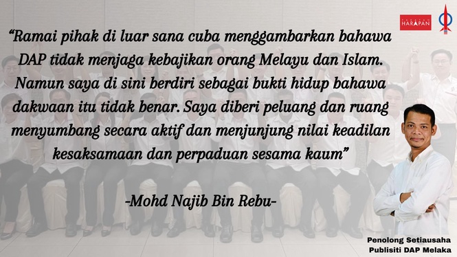 Timbalan Setiausaha Publisiti DAP Melaka, Mohamad Najib, dalam ucapannya menegaskan bahawa DAP adalah sebuah parti pelbagai kaum yang inklusif serta konsisten memperjuangkan hak semua rakyat Malaysia.