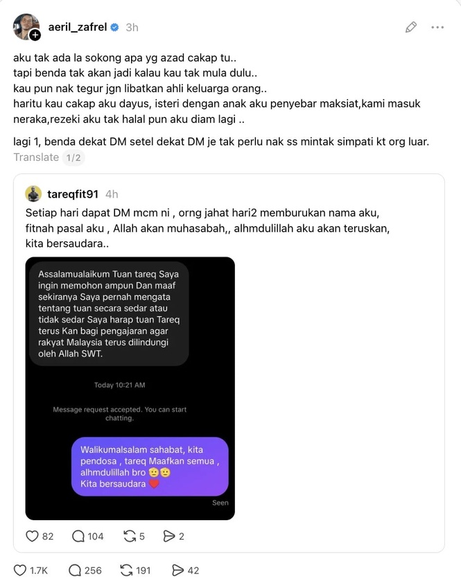 Menerusi hantaran di Threads, Aeril, 38, menegaskan bahawa dia tidak menyokong kenyataan Azad yang didakwa menghina ibu individu berkenaan, namun pada masa sama mengkritik sikap Tareq yang didakwa pernah menghina dirinya serta keluarga sebelum ini.