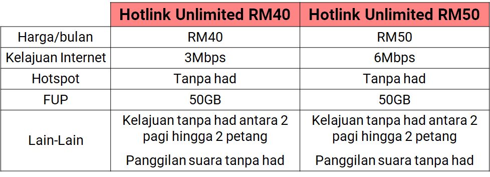 Untuk telco merah, Hotlink mereka ada dua pelan yang boleh anda pertimbangkan bermula pada harga RM40. Pada bulanan paras itu, anda boleh mengakses Internet pada kelajuan 3Mbps dengan had kelajuan dimansuhkan antara 2 pagi hingga 2 tengah hari.