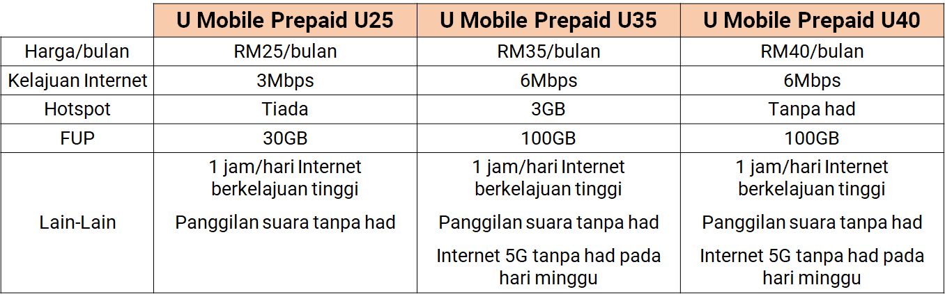 U Mobile ada tiga pelan yang boleh anda piluh dan mereka tawarkan pelan yang termurah dalam senarai ini.