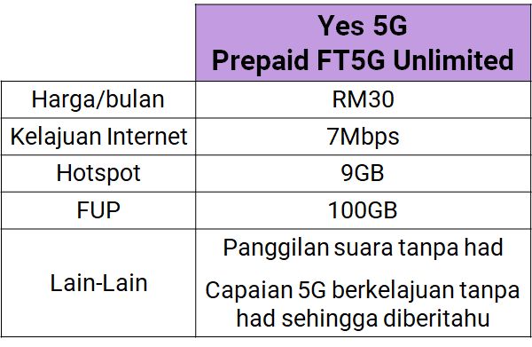 Satu lagi telco yang ada tawarkan 5G untuk prabayar adalah Yes 5G. Melalui pelan FT5G, anda boleh merasai kelajuan dan kuota 5G tanpa had sehingga diberitahu.