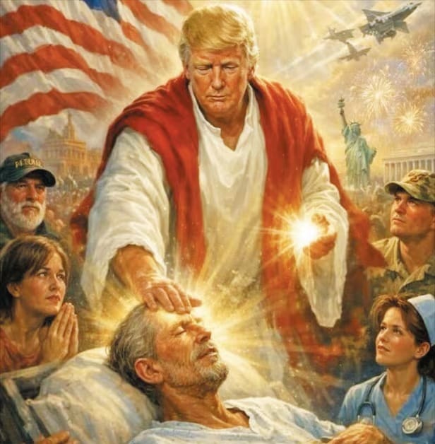 A global political figure, in a time of rising religious tension, during a conflict involving Iran, while feuding with the Pope, posts an image of himself visually modeled on Christ…