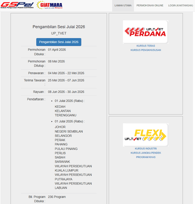 Permohonan GIATMARA ambilan bagi sesi Julai 2026 telah dibuka melalui laman sesawang UP_TVET (Perdana) bermula 01.04.2026 – 08.05.2026.