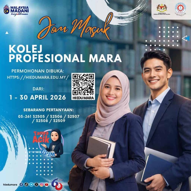Permohonan kemasukan ke Program Diploma Kolej Profesional MARA (KPM) bagi Pengambilan 2026/2027 dibuka bermula 1 – 30 April 2026, pukul 12 tengah hari. Anda boleh memohon melalui saluran SPUPIM: https://apponline.mara.gov.my/spupim_1/