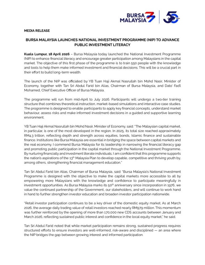 NIP selari dengan pelan nasional seperti Capital Market Masterplan 2026–2030 dan RMK13 yang fokus pada pendidikan kewangan, terutama untuk golongan muda.