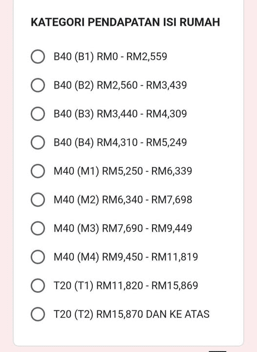 Kategori pendapatan isi rumah di Malaysia yang dibahagikan kepada B40, M40 dan T20 mengikut julat pendapatan bulanan.