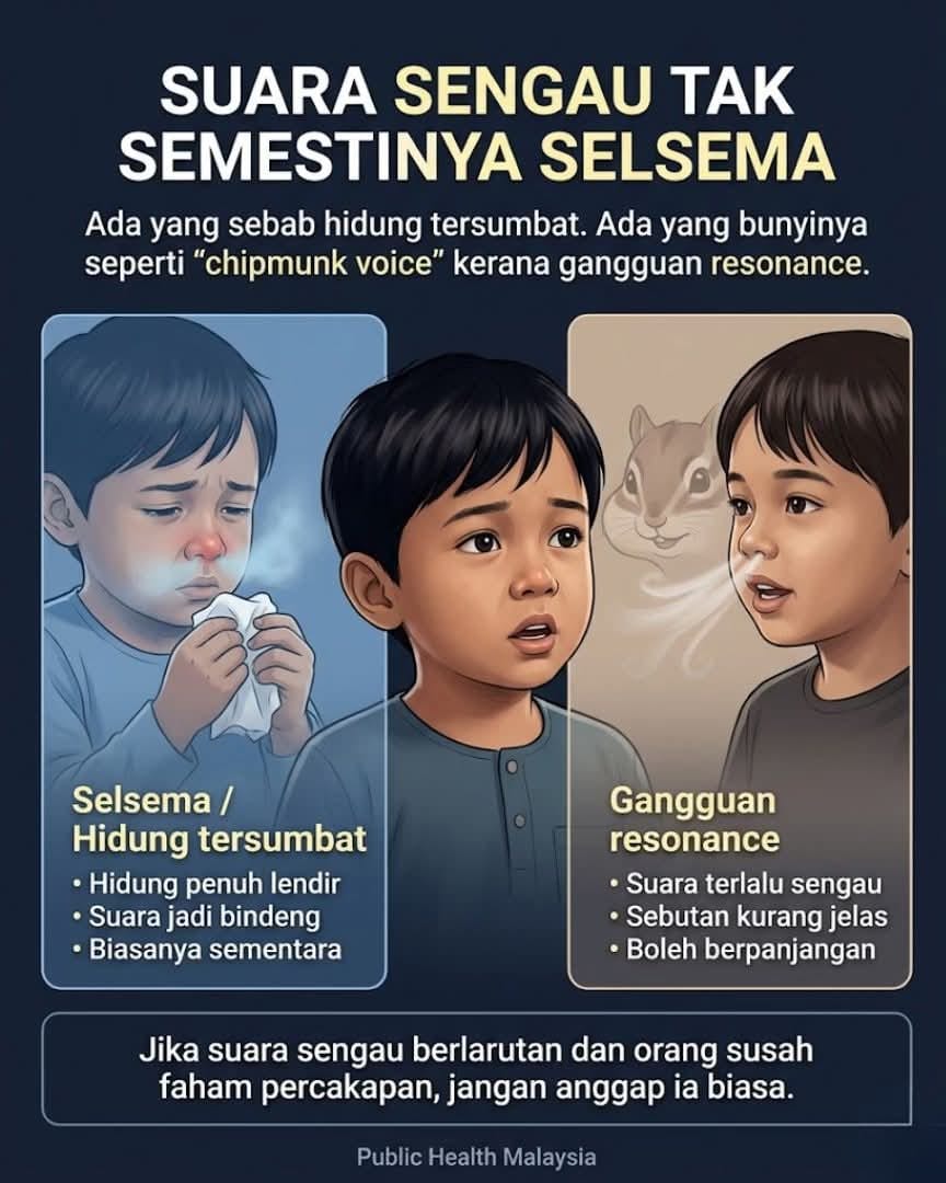 Kadang-kadang kita dengar anak atau orang dewasa bercakap dengan suara sengau, terus kita anggap hidung tengah tersumbat. Padahal tak semua suara sengau datang daripada selesema.