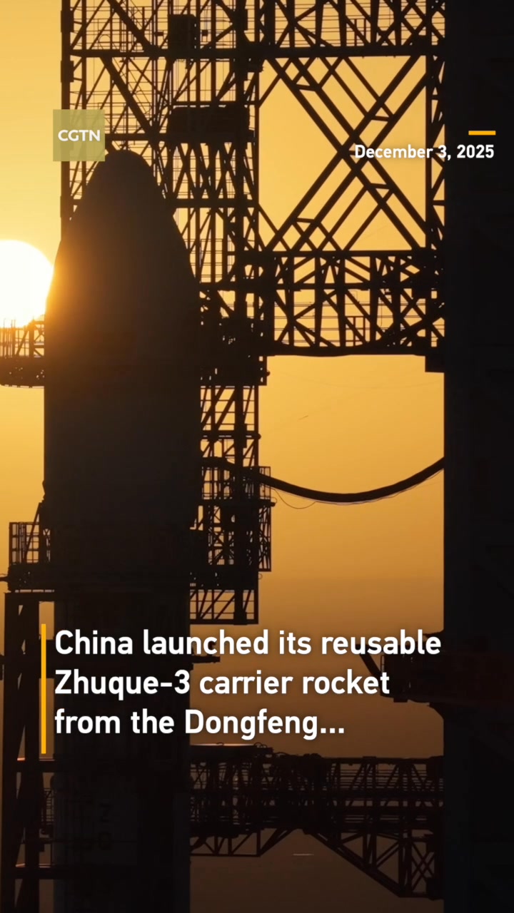 China launched its reusable Zhuque-3 carrier rocket from the Dongfeng commercial space innovation pilot zone on Wednesday. Powered by liquid oxygen and methane, Zhuque-3 is designed for low cost, high capacity and frequent launches. The mission validated the rocket's full-process design and system compatibility, collected key in-flight data and laid the groundwork for future operational launches and recovery tests, according to its developer LandSpace.