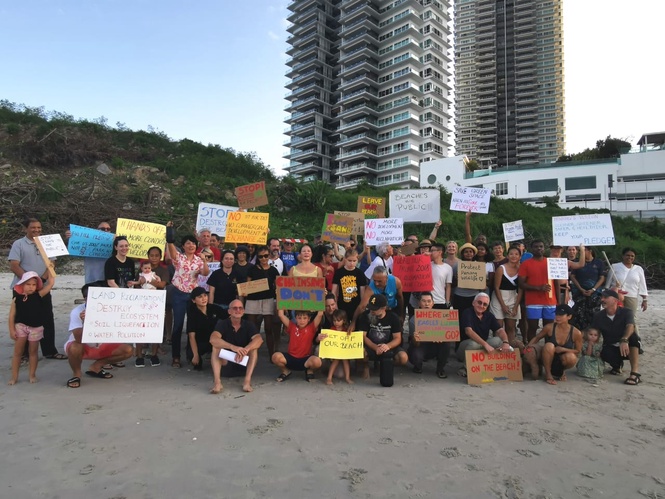 On Nov 1, more than 60 residents and supporters assembled along the shoreline known locally as the “Sore Thumb”, located next to the One Tanjong condominium by Lone Pine Group, carrying placards that read Stop Now, No Building on the Beach and Beaches Are Public.
